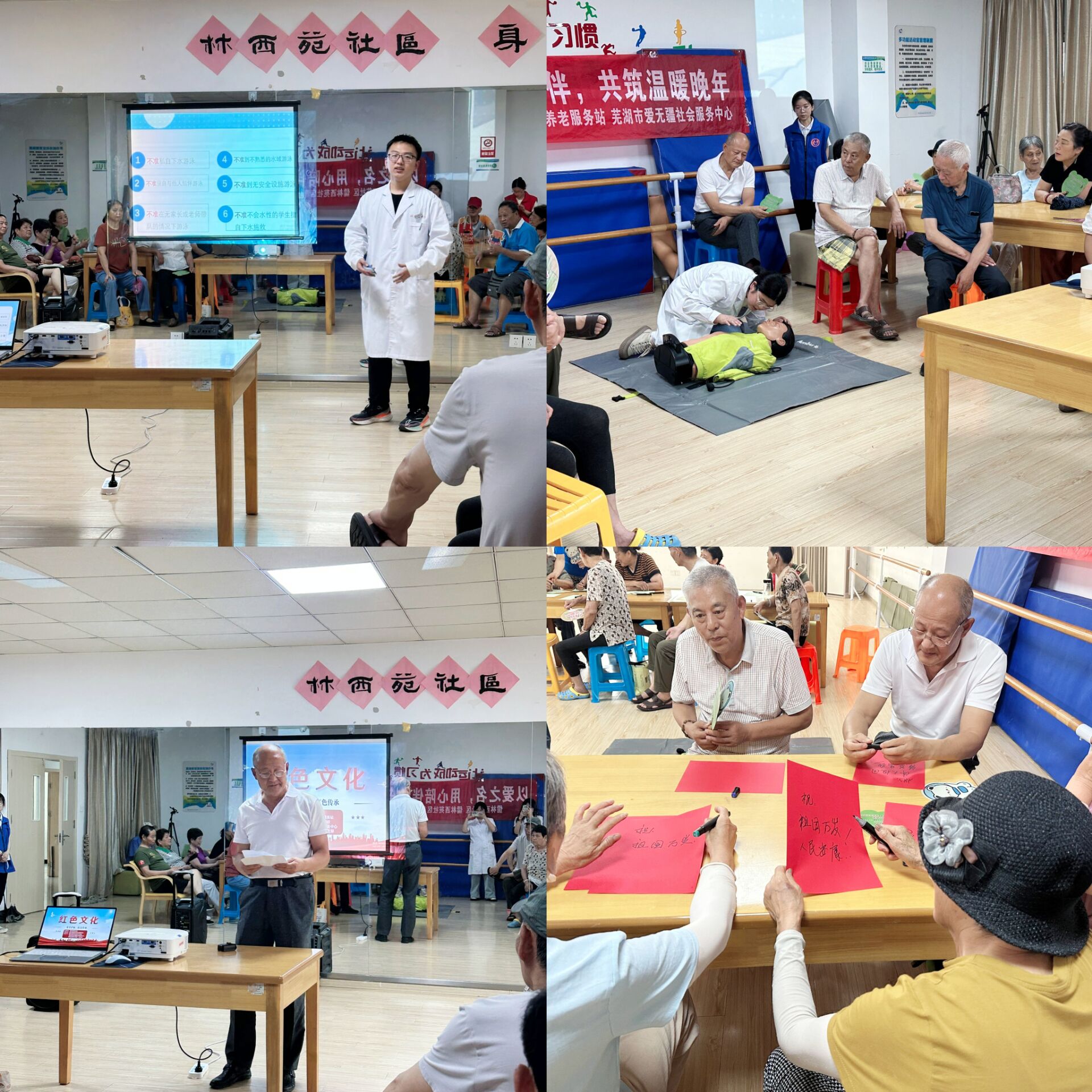 实践育人促传承,安全护航映初心。学生第一党支部联合儒林西苑社区党委开展“银发初心映青春”活动,70 岁老党员苗大爷以社区管理岗位的平凡经历为切入点,用质朴话语讲述数十年如一日坚守党员初心的历程:从挨家挨户调解邻里纠纷到牵头推动社区文化活动,从协调老旧设施改造到疫情期间主动值守卡口,每一个细节都折射出“密切联系群众、服务社区发展”的赤诚底色,令在场青年党员与居民深受触动。活动现场特设“红色寄语”环节,社区居民手执鲜红卡纸,挥笔写下“党辉照万家,初心永传承”“百年风华正茂,共赴时代新程”等滚烫祝福,成为社区党群同心的生动注脚。与此同时,防溺水安全教育同步开展。党员志愿者化身“安全讲师”,通过情景模拟还原溺水险情,以“互动问答+实操演示”形式详解防溺水“六不准”准则,并借助人体模型分步演示心肺复苏术的按压深度、频率及人工呼吸要点,现场居民争相参与实践操作,在沉浸式学习中筑牢安全防线。