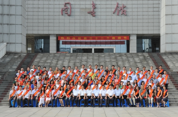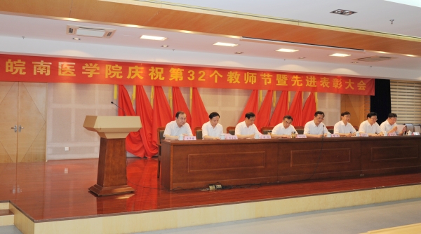 热血丹心育桃李,薪火相传写春秋。在全国第32个教师节之际,我校于9月9日在学术报告厅召开庆祝第32个教师节暨先进表彰大会,对2014/2015、2015/2016两个学年学校优秀共产党员、优秀党务工作者、先进党支部和优秀教师、优秀教育工作者、优秀辅导员、先进集体进行表彰。校领导王先俊、章尧、李刚、刘人人、廖圣宝、吴金月,处级干部,受表彰的先进集体和优秀个人,30年教龄教育工作者,师生代表以及临床(护理)学院代表近300人参加大会。大会由党委副书记、院长章尧主持。