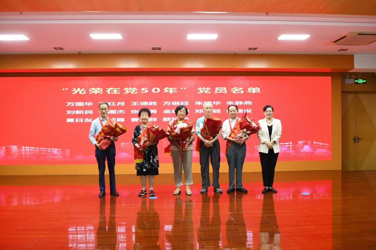 在热烈的掌声中,党委书记夏劲松向“光荣在党50年”党员代表颁发纪念章,新党员代表向老党员们敬献鲜花。