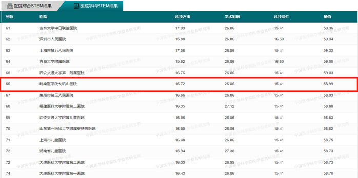 在五年总科技量值(ASTEM)排名榜单上,烧伤外科学排名全国第12名,神经外科学排名全国第32名,皮肤病学排名全国第42名,麻醉学排名全国第53名,变态反应学排名全国第63名,危重症医学排名全国第83名,急诊医学排名全国第98名。